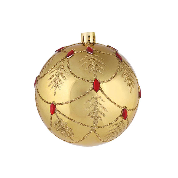 Украшение елочное шар золотой с красными стразами и блестящим рисунком 8см