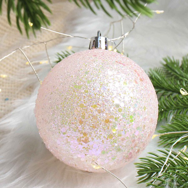 Мягкий розовый шар для украшения елки украшен множеством пайеток, которые переливаются при попадании света. Шар выполнен в нежном цвете розового золота, что придает ему праздничный и незабываемый вид. Этот новогодний декор легко крепится на ветки с помощью тонкой серебристой нити.
