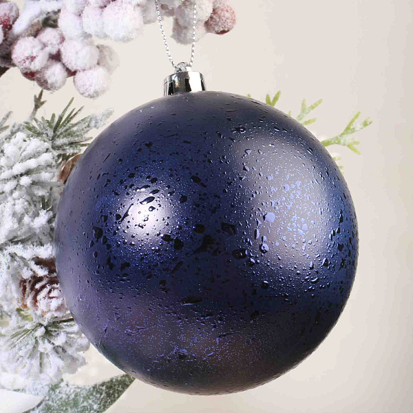 Элегантное винтажное ёлочное украшение в форме шара из пластика насыщенного синего цвета. Диаметр шара составляет 8 см. Поверхность украшения украшена эффектом «дождя» — рельефными капельками, создающими оригинальный текстурный рисунок и добавляющими глубину цвету. Изделие оснащено подвеской для удобного крепления на новогодней ёлке. Это украшение поможет создать атмосферу изысканного праздничного настроения и гармонично дополнит декор в классическом или винтажном стиле.