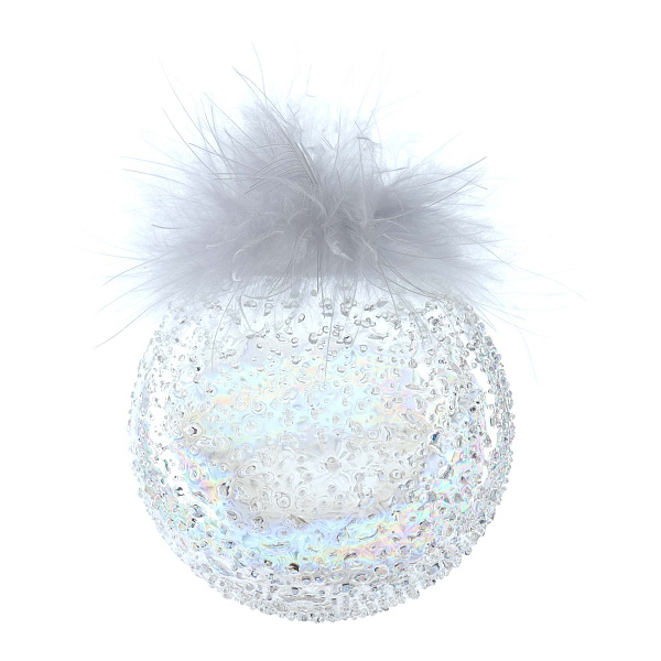 Украшение елочное Шар с рельефными каплями и белыми перышками прозрачный стекло 8см