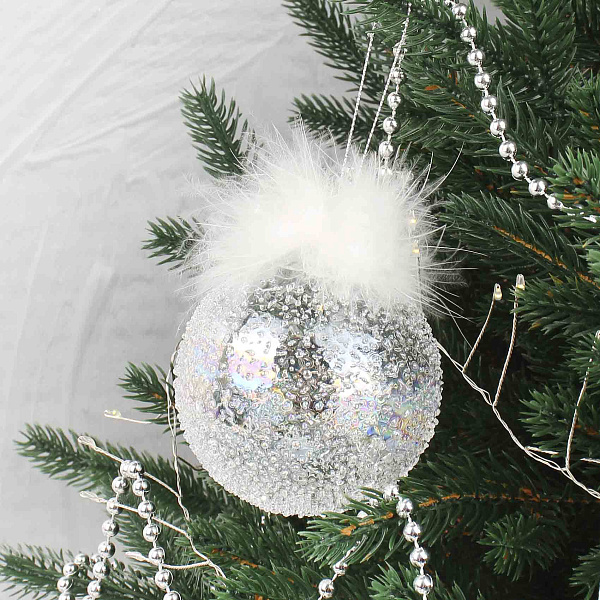 Диаметр шара составляет 8 см, что позволяет использовать его как эффектное украшение ёлок, гирлянд и праздничных композиций. Украшение оснащено прочной металлической петелькой с леской для удобного подвешивания.