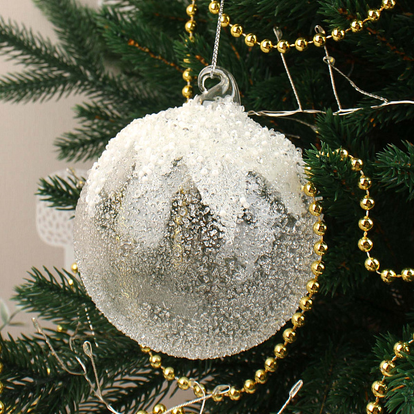 Елочное украшение в форме шара выполнено из прозрачного стекла. Особенность изделия — декоративный эффект капель, который придает поверхности объем и необычную текстуру. Украшение легко подвесить на новогоднюю елку с помощью серебристой нити. Такой шар долго сохраняет свой внешний вид, делая праздничное оформление более ярким и оригинальным.