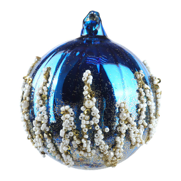 Украшение елочное Шар с узором из белого бисера с золотистыми элементами синий стекло 8см