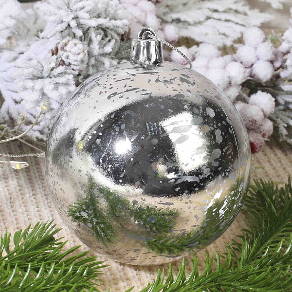 Винтажное елочное украшение в форме шара, выполненное из пластика с серебристым покрытием с эффектом старения. Диаметр шара составляет 8 см. Изделие отличается состаренным металлическим блеском с текстурными пятнами, придающими украшению атмосферу утонченности и ностальгии. Украшение оснащено подвеской для удобного крепления на новогодней елке, создавая изящный винтажный акцент в праздничном интерьере.