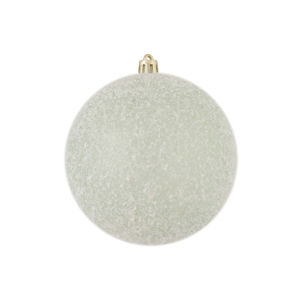 Елочный шар зеленого цвета выполнен из прочного пластика. Поверхность шара усыпана блестящим белым напылением, имитирующим снежный покров. Сочетание однотонного оформления и фактурной поверхности делает украшение заметным среди пушистых веток и других игрушек. Снежные узоры напоминают о зимних пейзажах, вносят морозной свежести в оформление елки.