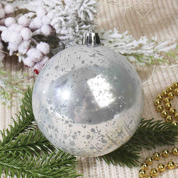 Винтажное елочное украшение в форме белого шара, выполненное из пластика с серебристым покрытием с эффектом старения. Диаметр шара составляет 8 см. Изделие отличается состаренным металлическим блеском с текстурными пятнами, придающими украшению атмосферу утонченности и ностальгии. Украшение оснащено подвеской для удобного крепления на новогодней елке, создавая изящный винтажный акцент в праздничном интерьере.