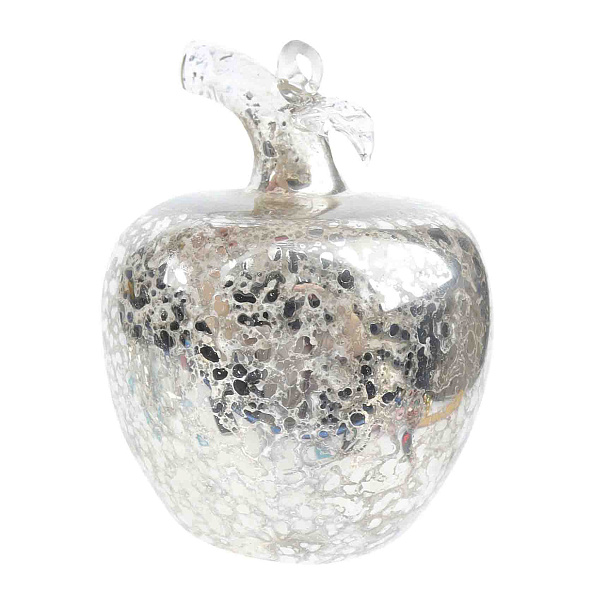 Елочное украшение в виде яблока выполнено из стекла с эффектом капель. Декор представляет собой объемную фигурку серебристого цвета размером 7 см. Украшение дополнено серебристой нитью для подвешивания.