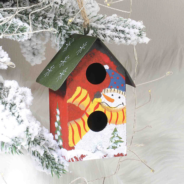 Украшение елочное в ретро-стиле — декоративный металлический скворечник высотой 9 см. Изделие выполнено в классической форме домика с металлической крышей темно-зеленого цвета, украшенной снежинками. Фасад скворечника расписан зимним мотивом — изображением улыбающегося снеговика в яркой шапке и шарфе с заснеженными деревьями. Украшение оснащено прочной пеньковой петлей для удобного подвешивания на елку или в интерьере.