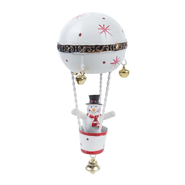 Украшение в виде воздушного шара в ретро-стиле выполнено из металла, высотой 15 см. Изделие представляет собой белый шар с розовыми звездочками и декоративной золотистой отделкой посередине. К корзине шара привязан милый снеговик в красном шарфе и черной шляпе. Украшение дополнено подвешенными маленькими золотистыми колокольчиками, создавая атмосферу праздника и уюта. Изделие оснащено пеньковой петлей для удобного подвешивания на елку или в интерьер.