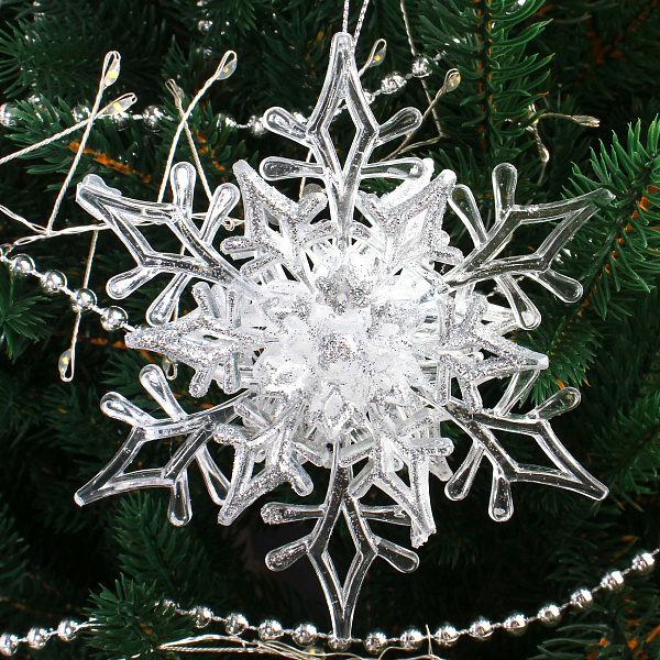 Елочная объемная игрушка в виде снежинки — стильный элемент декора в духе лофт, выполненный из прозрачного пластика и серебристого напыления. Диаметр снежинки составляет 11 см, что делает ее заметной и эффектной на праздничной елке. Украшение сочетает матовую белую основу с изящными серебристыми блестящими элементами, создающими объем и мерцание.