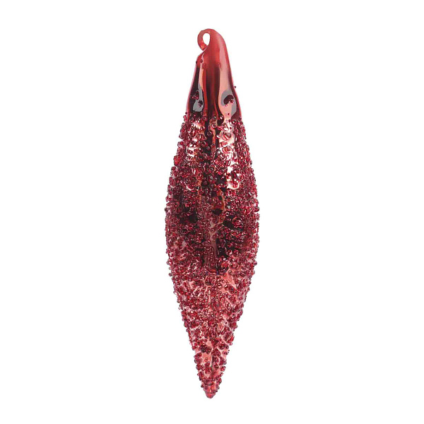 Украшение представляет собой елочную узкую сосульку в стиле лофт ярко-красного цвета, выполненную из стекла. Высота изделия составляет 15 см, что делает его заметным и эффектным элементом праздничного декора. Поверхность украшения украшена текстурой в виде капель, выполненной из мелких рельефных бусинок, создающих эффект мерцания и глубины. На верхней части расположена металлическая петля с золотистой ниткой для удобного подвешивания на елку или в интерьерные композиции.