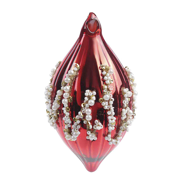 Украшение елочное Сосулька блестящая с узором из белого бисера красная стекло 13см