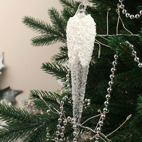 Елочное украшение в виде сосульки выполнено из стекла. Украшение выполнено в белом цвете с имитацией капель и декорировано мелким бисером. Фигурка имеет длину 15 см и подвешивается на серебристой нити, что позволяет легко разместить изделие на елке или другом декоре.