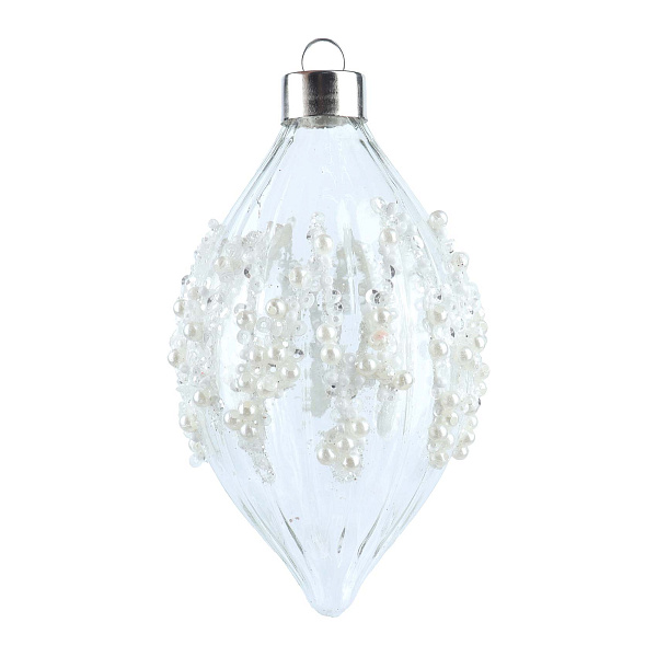 Ёлочное украшение в форме удлинённой сосульки с внутренним узором из прозрачных полос и объёмным декором из мелких жемчужных бусин — изысканный декоративный элемент, создающий атмосферу зимней свежести и лёгкости. Изготовлено из прозрачного стекла, благодаря чему изделие выглядит воздушным и нежным, а бусины добавляют текстурной выразительности и праздничного блеска.