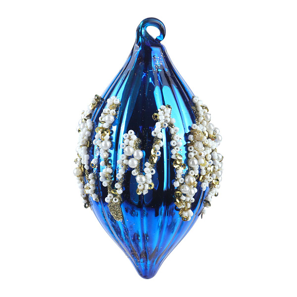 Украшение елочное Сосулька с узором из белого бисера с золотыми элементами синий стекло 13см