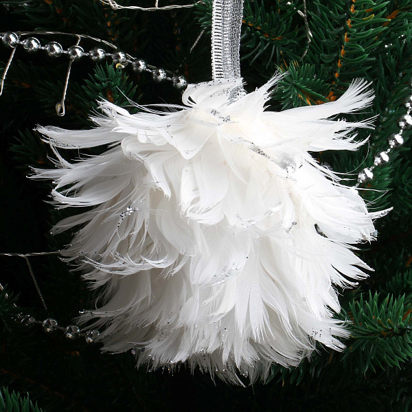 Изящный белоснежный цветок изготовлен из перьев. Это летящий танец нежности и лёгкости, воздушности и изящества, который можно подвесить в качестве декора на новогоднее дерево за небольшую петельку из полупрозрачной органзы.