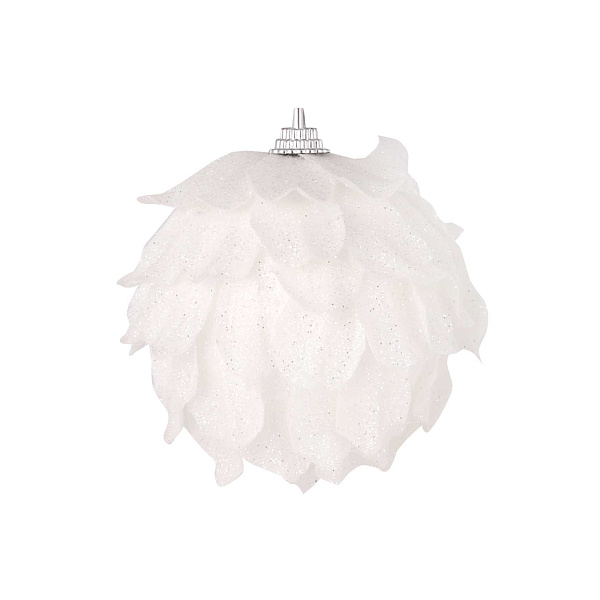 Основа игрушки изготовлена из пластика и декорирована нежными, практически невесомыми лепестками белого цвета, усыпанными серебристым глиттером. На макушке закреплена серебристая фурнитура, с помощью которой игрушка подвешивается на хвойную ветку.