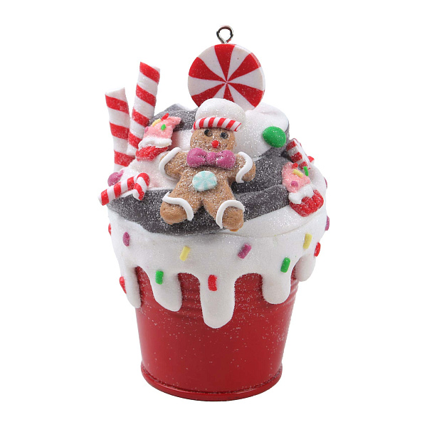 Новогоднее елочное украшение в виде праздничного ведерка, украшенного белой глазурью, разноцветной посыпкой и пряничными элементами — пряничным человечком, конфетами и сахарной палочкой. Изделие выполнено из полирезина с красочным декором и имеет высоту 11 см, что делает его заметным и необычным акцентом на елке.