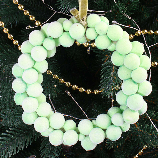 Новогодний венок «Пушистые ягоды» выполнен в зеленом цвете и имеет диаметр 12 см. Украшение состоит из множества небольших шариков с текстурой, напоминающей мягкий велюр. Венок изготовлен из пластика и текстиля, что делает его легким и удобным для декорирования разных поверхностей. Венок крепится на велюровую ленту. Его можно подвесить на елку, двери, стены или окна.