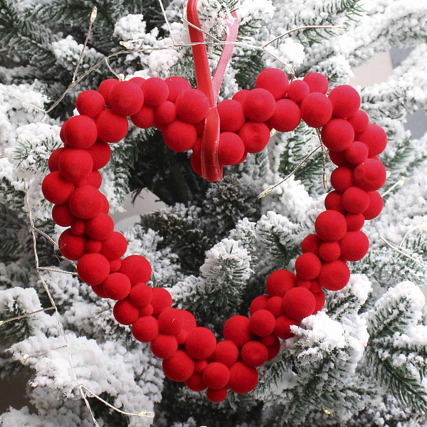 Декоративный венок в форме сердца выполнен в стиле хюгге — нежное и уютное украшение, идеально подходящее для создания теплой атмосферы в интерьере. Изготовлен из пластика и покрыт матовым красным покрытием с бархатистой текстурой, имитирующей мягкие бусины различного диаметра. Размер венка составляет 12 см, что позволяет использовать его как самостоятельный элемент декора или дополнение к праздничным композициям.