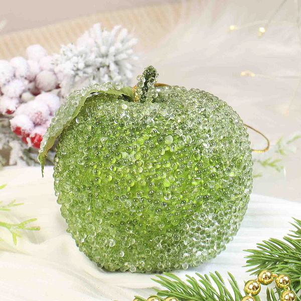 Зеленое украшение в форме яблока, выполненное в стиле шебби, станет ярким и оригинальным элементом праздничного декора. Изготовленное из пластика, изделие покрыто множеством мелких прозрачных бусин, создающих эффект свежей утренней росы на насыщенной зеленой поверхности. Текстильный листок придает композиции дополнительную натуральность и изящество.