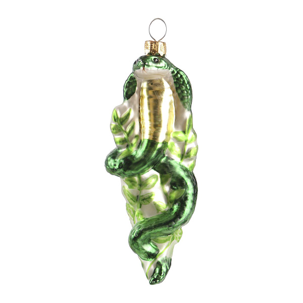Елочная игрушка «Змейка» выполнена из стекла и станет изысканным украшением новогодней елки. Тщательно проработанные детали придают игрушке реалистичный вид, а блестящая поверхность добавляет нарядности. Изделие украшено зелеными листьями, что создает ощущение природной гармонии. Эта елочная игрушка подойдет для создания тематической праздничной композиции с символом 2025 года.