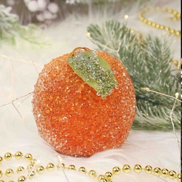 Оранжевое украшение в форме апельсина, выполненное в стиле шебби, привнесет в праздничный интерьер яркий и свежий акцент. Изготовленное из прочного пластика и украшенное множеством мелких прозрачных бусин, оно создает искрящийся эффект, напоминающий капли утренней росы на сочном фрукте. Нежный зеленый листок из ткани дополнительно подчеркивает натуральность и изящность композиции.