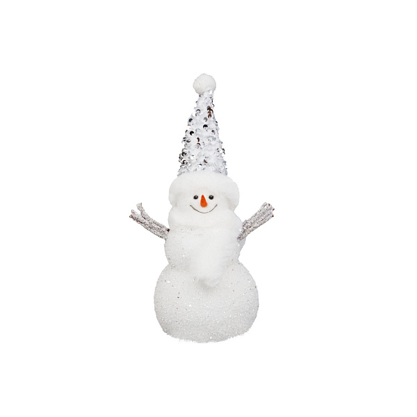 Фигурка снеговика полна очарования и серебряного блеска, создавая эффект яркого и снежного морозного зимнего дня. В качестве основы для фигурки снеговика используется материал, покрытый блестками и тонкими мерцающими пауетками. Руки и улыбка снеговика соответствуют сказочным традициям и изготовлены из веточек, припорошенных блестками, словно инеем. Нос и глаза выполнены из пластика. Вместо ведра на голове снеговика высокий белый колпак из ткани с серебристыми блестящими пайетками, помпоном и меховой опушкой. Снеговик станет чудесным дополнением праздничной композиции и создаст новогоднее настроение не только детям, но и взрослым.