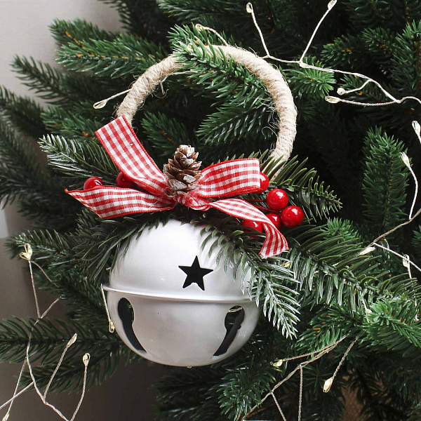 Украшение в виде белого металлического бубенца диаметром 9 см — стильный и атмосферный аксессуар в ретро-стиле. Бубенец украшен искусственными еловыми веточками, яркими красными ягодами, небольшой шишкой и красно-белой клетчатой лентой, что придает изделию праздничность и уют. Удобное крепление позволяет легко подвесить украшение на дверь или в любой уголок дома.