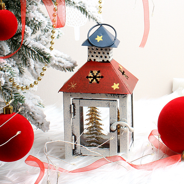 Новогодний декор в виде фонаря в стиле ретро, выполненного из металла высотой 18 см. Фонарь украшен красной крышей с вырезанными снежинками и рисунками звезд, а боковые стекла имеют изображение Санты-Клауса и зимних елочек, что создает атмосферу зимнего волшебства и уюта. Металлическая конструкция с легким ретро-эффектом придает украшению винтажный шарм, а компактный размер делает его идеальным элементом праздничного интерьера или подарком. Этот декоративный фонарь подарит дому теплое новогоднее настроение и уютную атмосферу зимних праздников.