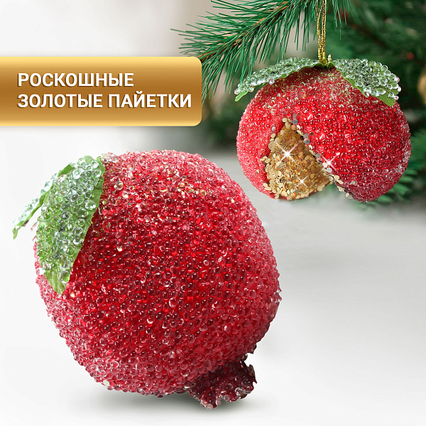 Украшение в виде граната насыщенного красного цвета в стиле шебби — оригинальный декоративный элемент для праздничного оформления интерьера или новогодней ёлки. Изделие выполнено из пластика и украшено мелкими бусинками и блёстками, имитирующими текстуру и блеск настоящего граната. Декор дополнен зелёными листочками с эффектом инея, что придаёт изделию дополнительную изысканность и натуральность.