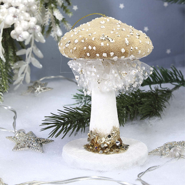 Новогоднее украшение в форме гриба станет изысканным акцентом на елке. Верхняя часть выполнена из мягкого велюра приятного бежевого оттенка. Золотистые блестки равномерно распределены по ножке гриба. Полупрозрачный тюль добавляет легкость и воздушность изделию, будто окутывая его зимним волшебством. Надежная подвеска золотистого цвета позволяет легко закрепить украшение на ветках.