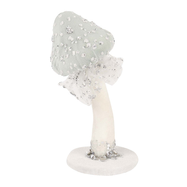 Елочное украшение в форме гриба превратит дом в сказочный лес. Игрушка изготовлена из мягкого велюра, а шляпка гриба украшена нежным тюлем, поэтому украшение идеально подходит для домов, где есть маленькие дети и домашние животные, ведь оно не разобьется при падении. Ножка гриба украшена серебристыми блестками и бисером.