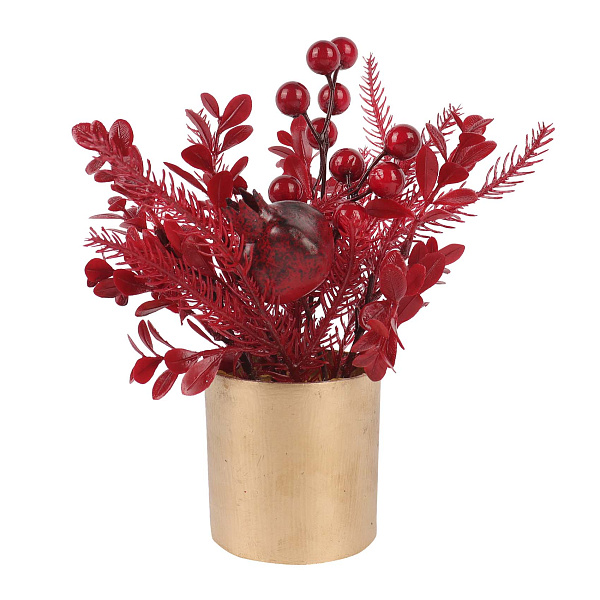 Кашпо золотистого цвета придает изделию элегантность и праздничный блеск. Ветки насыщенного красного оттенка с реалистичными ягодами и листочками добавляют композиции живости и объема. Декор устойчив к внешним воздействиям, что позволяет использовать его многократно.