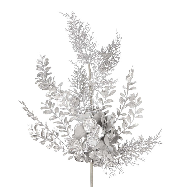 Новогоднее украшение в виде ветки с блестящим серебристым покрытием дарит праздничное настроение и ощущение зимней сказки. Веточка выполнена из пластика и имитирует изящные листочки и цветы. Серебристое покрытие придает изделию особый блеск и благородство, позволяя использованию как в классических, так и в современных интерьерах.