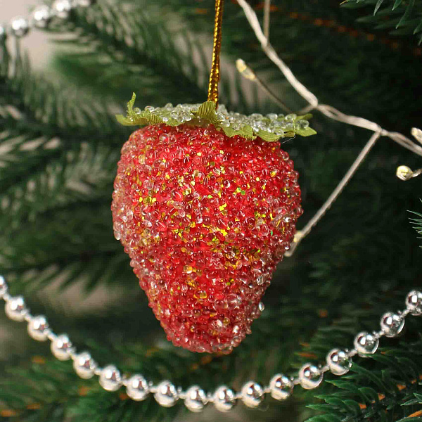Елочная игрушка в виде клубники диаметром 4 см — оригинальный аксессуар для праздничного и интерьерного декора. Выполнено из пластика и украшено мелкими бусинками, создающими эффект капелек росы, что придает ягодке натуральный и изысканный вид.