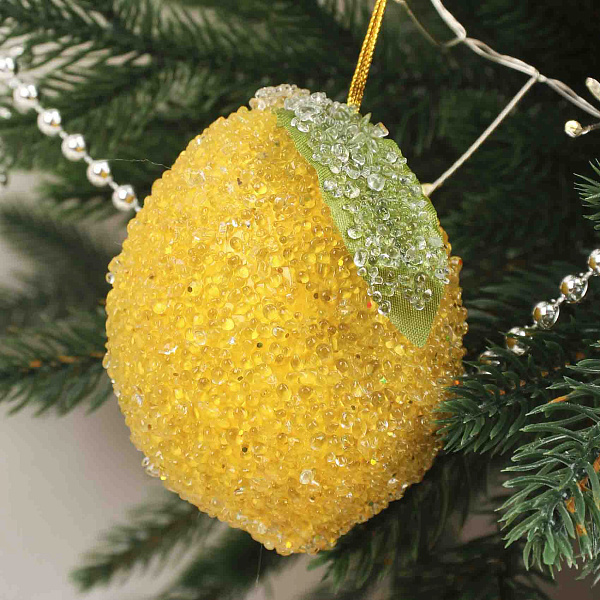 Желтая елочная игрушка в форме лимона, выполненное в стиле шебби, станет ярким и оригинальным акцентом в праздничном интерьере. Изготовленное из пластика с текстурированной поверхностью, украшение покрыто мелкими прозрачными бусинами, которые придают лимону искрящийся эффект, напоминающий капли росы. Нежный зеленый листок из ткани дополняет композицию, создавая реалистичный образ.