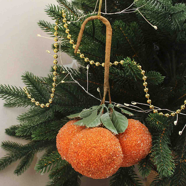 Оранжевое украшение в форме трех маленьких мандаринов, выполненное в стиле шебби, привнесет в праздничный интерьер яркий и свежий акцент. Изготовленное из прочного пластика и украшенное множеством мелких прозрачных бусин, оно создает искрящийся эффект, напоминающий капли утренней росы на сочном фрукте. Нежные зеленые листочки из ткани дополнительно подчеркивают натуральность и изящность композиции.