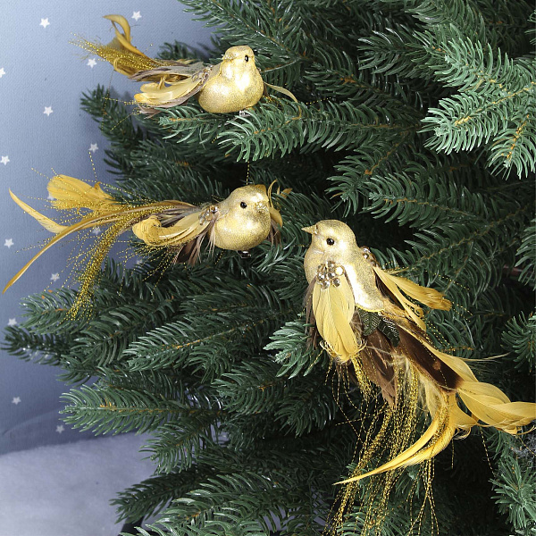 Элегантное елочное украшение в форме золотистой птички станет ярким акцентом для новогоднего дерева. Изготовленное из легкого и прочного материала украшение сочетает в себе изысканность и долговечность. Блестки, украшающие поверхность изделия, создают эффект мерцающего золота. Птичка дополнена мягкими перьями, которые придают ей изящный и утонченный вид.
