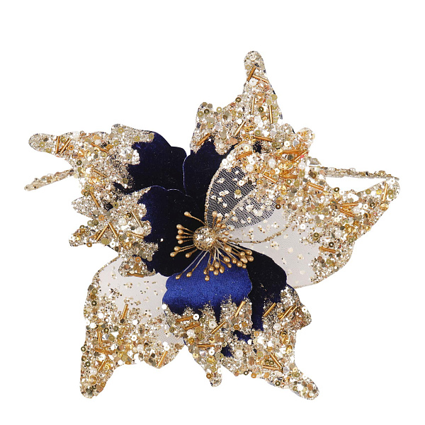 Украшение новогоднее Пуансеттия на прищепке с бисером синий велюр 17см