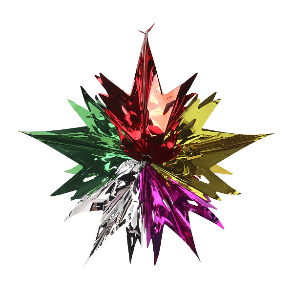 Объемная снежинка из разноцветной фольги — эффектный элемент для праздничного декора. Диаметр составляет 40 см, что делает ее заметным акцентом в любом интерьере. Яркие оттенки создают переливающийся эффект, привлекая внимание и добавляя комнате атмосферу радости и уюта.