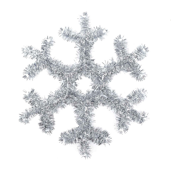Подвесная снежинка серебристого цвета станет удачным украшением для любого интерьера. Она покрыта пушистой мишурой, декорирована блестящими звездочками. Их поверхность способна отражать свет под неожиданным углом, обеспечивая интересный зрительный эффект. Декоративный элемент можно закрепить по своему усмотрению, удивив детей и взрослых. Он подчеркнет важность и тематику приближающегося праздника.