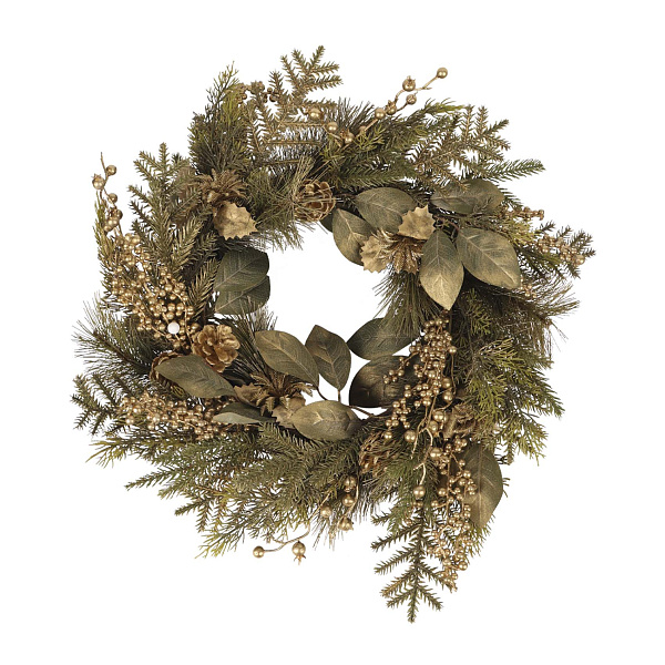На венке расположены искусственные хвойные веточки и листва, дополненные золотыми элементами. Это создает эффектный контраст и добавляет элегантности. Декоративные детали выполнены с высокой точностью, что позволяет украшению выглядеть естественно и привлекательно.