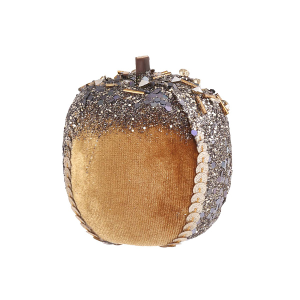 Светло-коричневая поверхность яблок покрыта золотистым глиттером, переливающимся на свету. Для подвешивания на елке украшение имеет подвеску в виде золотистой цепочки.