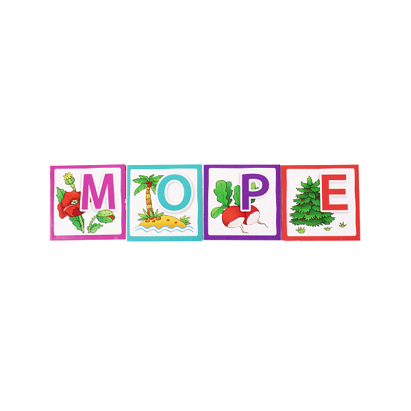 В наборе: 9 кубиков, 54 буквы, система заданий, специальный поддон для игр и хранения