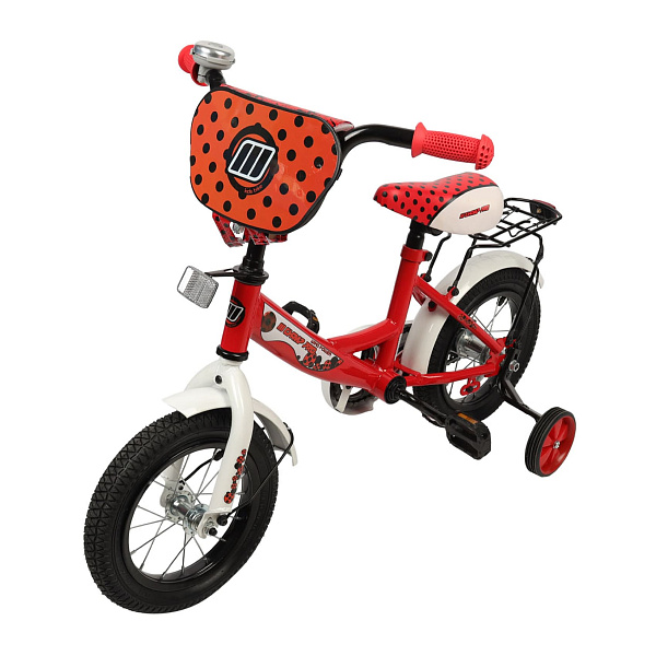 Детский велосипед порадует ребенка, который любит божьих коровок, ведь его окрас выполнен в красном цвете с контрастным черным горошком. Два больших колеса дополнены двумя маленькими, они повышают устойчивость детского транспорта на дорогах. Прорезиненные колеса обеспечивают хорошее сцепление с дорогой. Сиденье велосипеда регулируется по высоте. Стальная рама прочная и выдержит столкновения и падения. Ручки руля прорезинены, поэтому ладони ребенка не соскользнут во время поездки. Выбора скоростей нет, но есть громкий звонок, который повышает безопасность ребенка на дорогах. Дополнительно на раме есть светоотражатель.