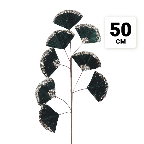 Ветка декоративная Гинкго велюровая с золотистыми блестками зеленая 50см