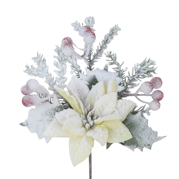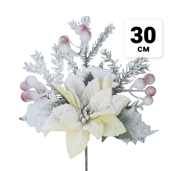 Ветка декоративная Клематис с зеленой хвойными веточками и красной рябиной золотистый с эффектом инея 30см