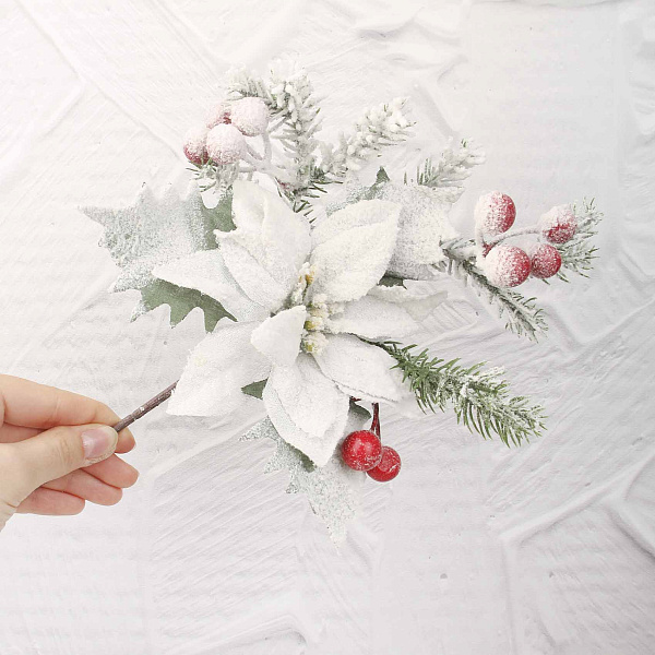Ветка декоративная Клематис с зелеными хвойными веточками и красной рябиной белый с эффектом инея 30см