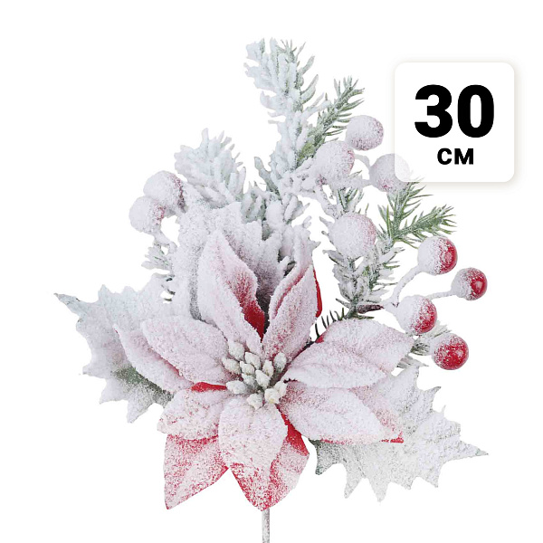 Ветка с клематисом красного цвета, украшенная эффектом инея — это изящный декоративный элемент в винтажном стиле, выполненный из пластика. Высота ветки составляет 30 см, что делает её удобной для использования в праздничных композициях, букеты, венки или интерьерный декор.